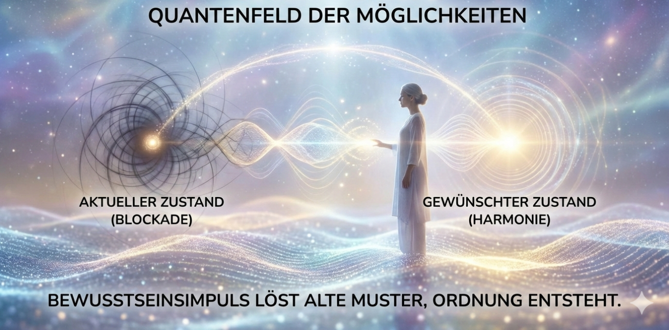 Dabei werden zwei Punkte im Energiefeld wahrgenommen: einer steht für den aktuellen Zustand (z. B. Blockade, Thema, Disharmonie), der andere für den gewünschten Zustand (z. B. Harmonie, Ordnung, Heilimpuls). Durch bewusste Präsenz, innere Ruhe und klare Ausrichtung entsteht ein Impuls, der dem System ermöglicht, sich neu zu ordnen. Körper, Geist und Seele können wieder in Einklang kommen und die Selbstheilungskräfte werden angeregt.